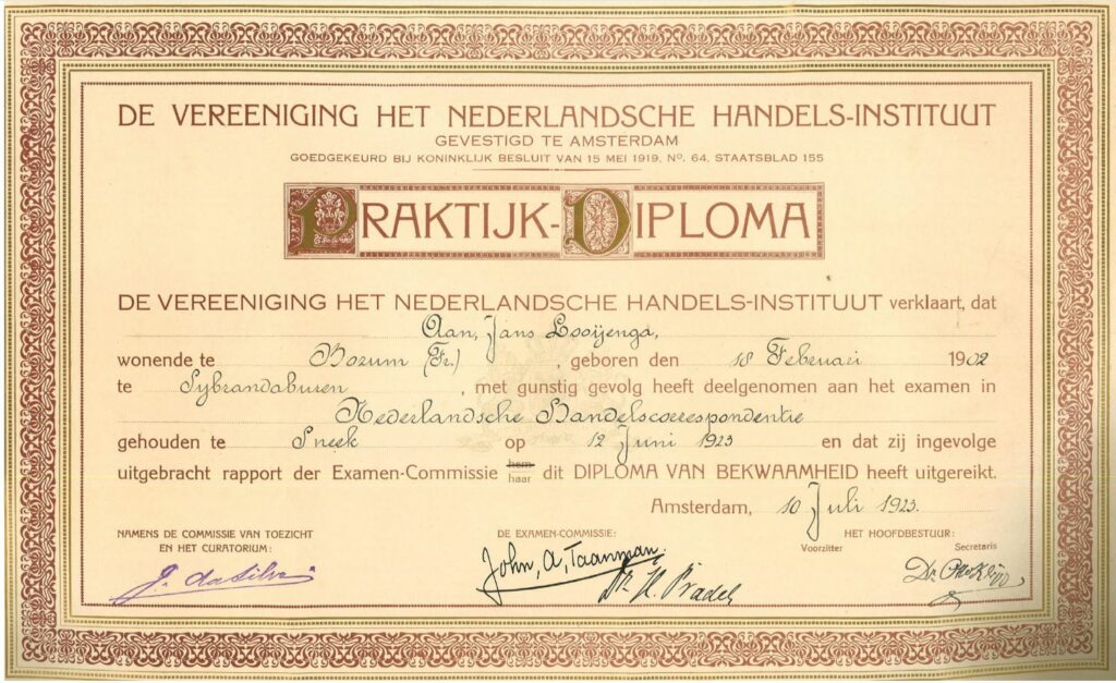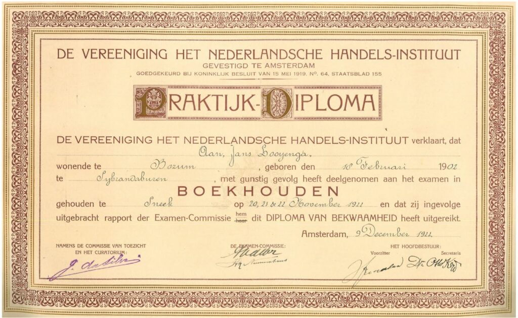 Hij hie yn 1922 en1923 syn praktijkdiploma’s boekhâlden al helle en dat koe der ek mooi brûke mei syn wurk.