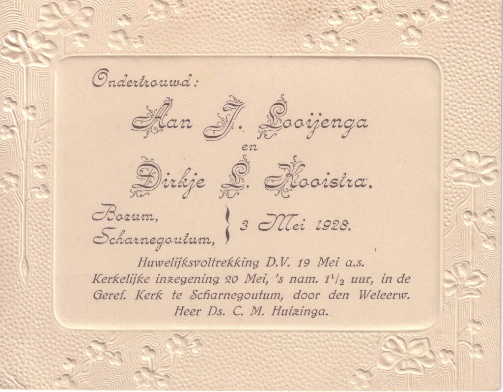 Doe’t Aan Looijenga en Durkje Kooistra trouden op 19 maaie 1928, wenne Aan al yn Boazum, syn âlden, broer Michiel en suster Afke wennen doe op de Flearen. ( Sjoch it ferhaal fan de Flearen en Michiel Looijenga). Der wiene noch 2 broerkes en 1 suske west mar dizze stoaren allegearre op jonge leeftijd.