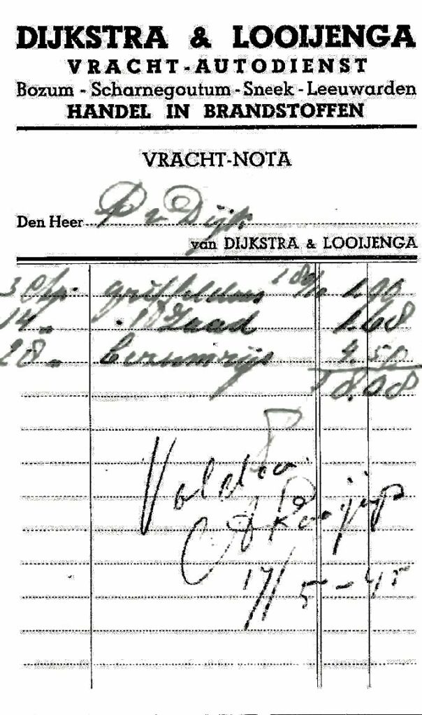 Op Vrijdag ging Pake naar Leeuwarden en vaak gingen mijn Heit en Oom Lammert om de beurt met Pake Aan Looijenga mee. Voor de Tweede Wereldoorlog zou Nelis Dijkstra met de vrachtwagen naar Leeuwarden gaan. Kort nadat de Tweede Wereldoorlog begon, stalen de Duitsers de vrachtwagen, dus ging het bedrijf terug naar het gebruik van paard en wagen. Het was in die tijd dat Pake Aan alleen naar Leeuwarden ging. Toen mijn Heit en Lammert wat ouder waren, kwamen ze dan langs om ervoor te zorgen dat niemand hun eigendommen zou stelen terwijl Pake Aan de zaken zou regelen. De vracht werd in Leeuwarden opgehaald en afgezet waar de klant het wilde laten bezorgen.