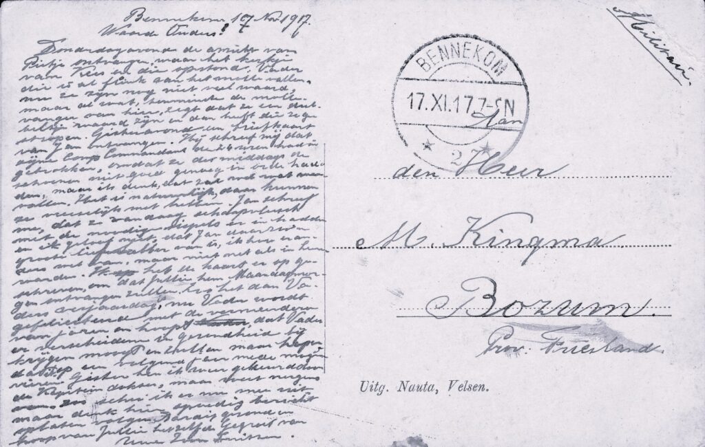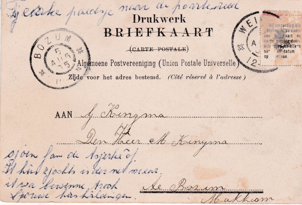 in jier as 40 lyn, krige de Doarpsskille fan Lipkje van der Werf in stikmannich kaarten út de 1e wrâldkriich. Se wiene skreaun fanút Boazum troch in mouike fan Lipkje ( Fetsje Kingma) en in omke Lútsen Kingma (Fetsje har broer dy’t yn it leger siet). De redaksje (Jan Zantema) hat doe allinnich de korrespondinsje opskreaun, mar de kaarten net kopieert. We ha no bij de famylje nei frege, as de kaarten as brieven der noch wiene, Nei wat sykjen kamen der wat kaarten foar it ljocht. It wiene net de kaarten, wer’t wij nei sochten. Mar der kamen wol bisûndere kaarten oan it ljocht. Earst efkes in oersjoch hoe as de famylje yn elkoar stekt.