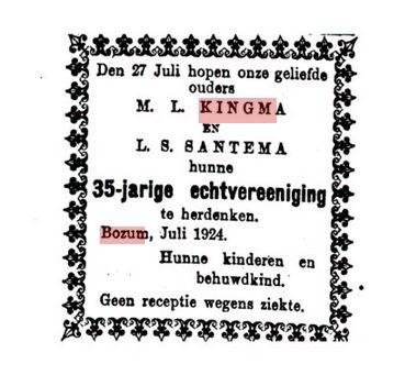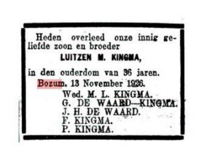 T.w. Luitzen Kingma geboren op 21 mei 1890 (ze woonden toen nog in Jellum) Hij zat ten tijde van de 1e wereldoorlog 1914-1918 in dienst. Hij is jong gestorven.