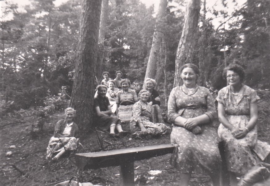 Vrouwenvereniging: Wees een Zegen eind jaren 50. v.l.n.r: Renske  Breeuwsma-Zwager, Roelofke Groen-de Boer , Marijke Dijkstra-Dijkstra , Detsje Keuning- Joustra, Geertsje Reitsma- Siderius, Tiete Breeuwsma, …?…, Trijntsje Wijnia-de Jong,voor aan …..?…en vr KLaassen-Broos.