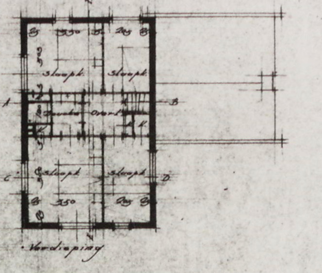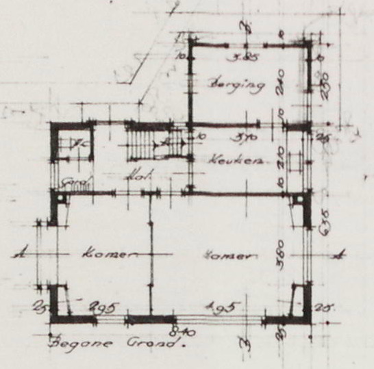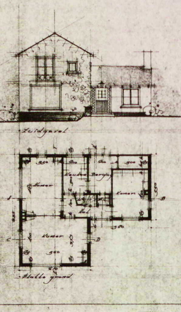 Op deze plek ontwierp de architekt een huis met twee kamers van 5,55m bij 3,50m, links. Rechts nog een (werk-?) kamer van ongeveer 3 bij 4 m. Zie de volgende tekening. Rechts zie je het raam van de werkkamer met daarnaast de voordeur. Op het plattegrondje eronder staat de indeling van het huis. Het hoofdgebouw links is 9,35 bij 6,10 m2. Een ruime woning dus, zeker voor die tijd. Daar tegenaan was nog een ‘aanbouw’ van 5,20 bij 5,50 m2. Zodat je echt van een ruime woning mocht spreken, een Dominee waardig.