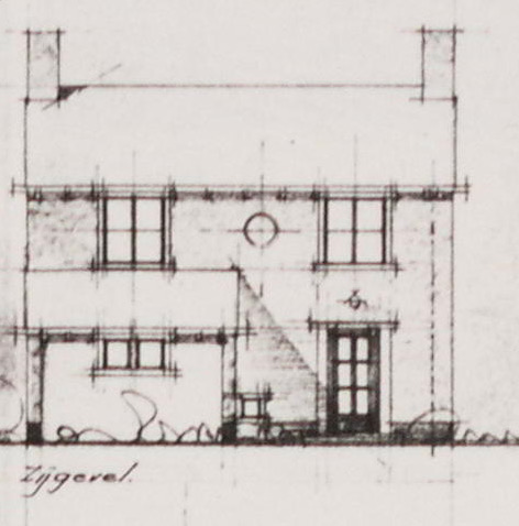 Op de eerste tekening staat de zijgevel aan de linkerkant van het huis, met de voordeur. Op de plattegrond is dat de bovenkant van de tekening. We zien de Zijgevel alsof we met onze rug naar de Beatrixbosjes staan.
