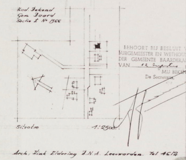 Op de onderstaande tekening is de alternatieve plek te vinden voor het tweede plan. Dit werd door B&W goedgekeurd. Zie de stempel en de handtekening van Secretaris Tjaberings. Op deze plek werden door de Gemeente uiteindelijk Waltawei 1 en 3 gebouwd.