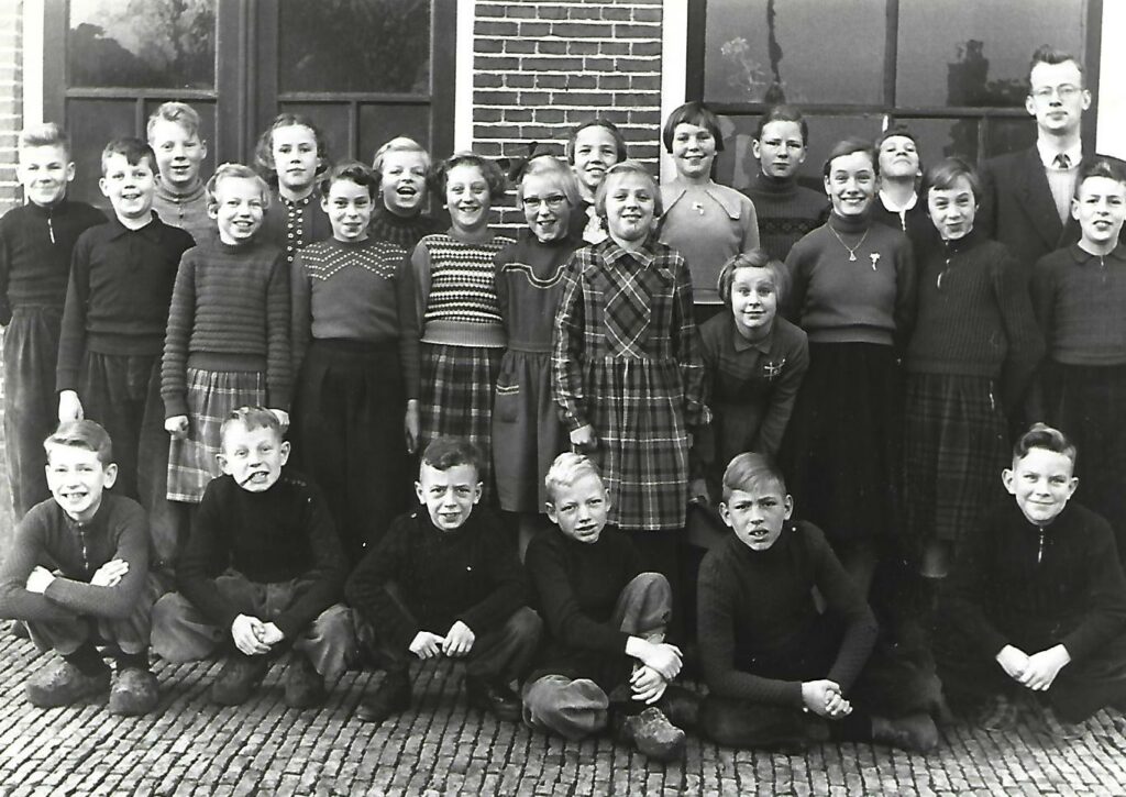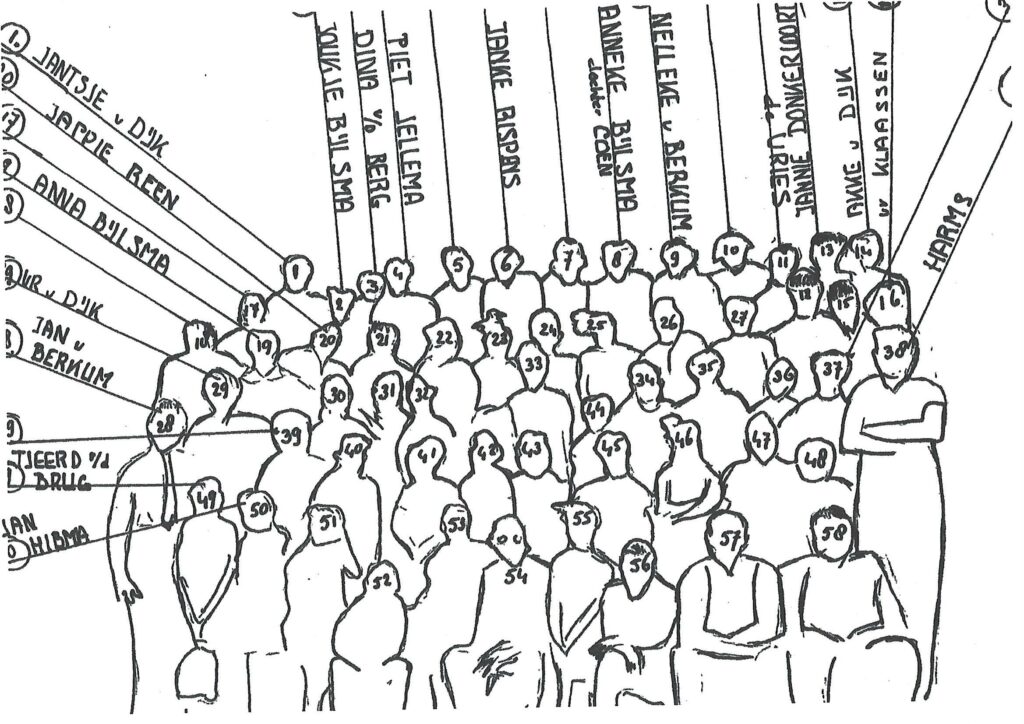 Boven v.l.n.r; KLaas Zwaga, Melle v/d Leest, Auke en Antsje Siedsma, Anke Miedema, Jike Hiemstra, Femmy Bos, Cobie Pool, Alie v/d Wal, Janny Smit, Tjitske v/d Leest, Griet en Antsje Hoitenga,, Willemke v Dijk, Annigje Fransbergen, Emy Neijenhuis, Tina Weidema, Gerrit Hiemstra, meester de Haan. Onder v.l.n.r: Franke de Jong, Sjoerd Fransbergen, Ton Meijer, Foppe Hoekstra, Tjeard v/d Wal en Dick Meijer. Mochten er namen bij staan die niet kloppen, mail dit even door naar franstolsma@ziggo.nl