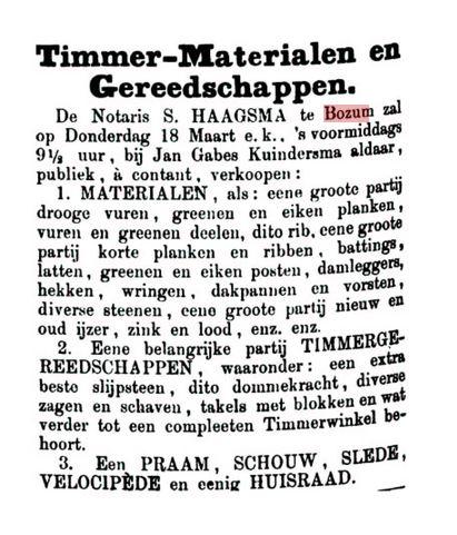 It gong om it hiele perceel: It bliuwt in skofkte yn eigen besit fan de famylje. De hierders koene bliuwe tink ik. Mar der siet dus noch wol in timmerwurkpleats yn. Earst huurder timmerman Jan Gabe Kuindersma en yn 1875 komt it yn hannen fan Hendrik Wiegers Wijnia (ek timmerman). Kuinersma ferstjert yn 1879, en yn 1892 komt it yn hannen fan Trijntje Gerrrits Tjallema. (Ek gjin ûnbekende namme yn Boazum). Se wie boerinne yn Boazum en giet letter nei Snits. Sy ferkeapet dit gedielte oan de vereniging “De kerkelijke kas” fan de Gerifformearde Tsjerke.