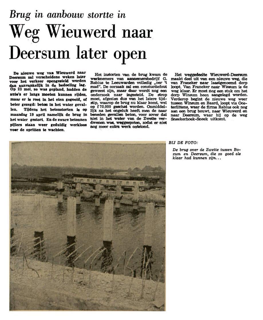 Elkenien is it tink hast fergetten, want de brêge fan ôf Dearsum nei Wiuwert leit er sa lang. Der waard begjin 70er jierren in dyk oanlein fan Dearsum nei Winsum. Eartiids wie dizze dijk der net. En it wie hiele ferbettering, want we hoegden net mear nei Dearsum mei de oerhaal oer de Swette. Mar it gong in 1971 ferskriklik mis mei de brêge. Dy wie hast klear en stoarte alhiel yn. Dat. is no 54 jier lyn.